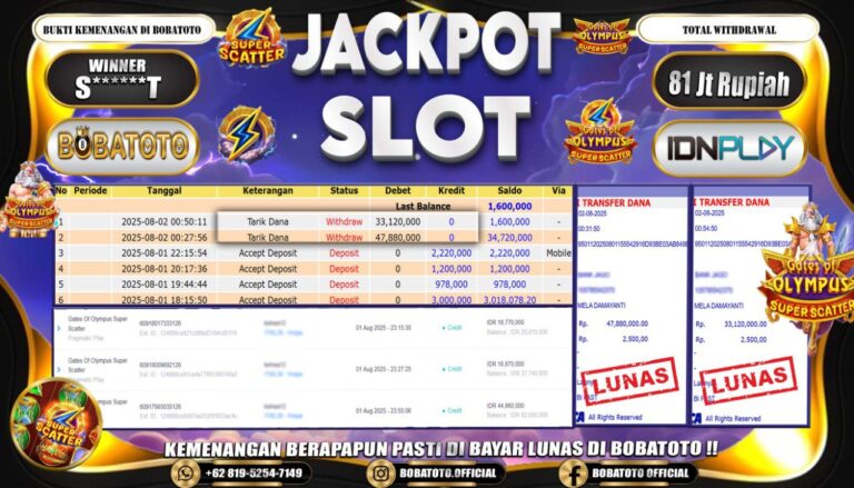 BOBATOTO – Selamat kepada User id : Y******0 Telah berhasil mendapatkan kemenangan besar pada permainan SLOT PRAGMATIC GATES OF OLYMPUS 1000 Dengan kemenangan Sebesar Rp.102,000,000,-. Setelah mengisi formulir withdraw dengan kurung waktu hanya 5 – 10 menit pihak bobatoto sudah melakukan transfer kepada pemilik Userid dan dana sudah dapat di cairkan oleh pemenang. Bukti pembayaran yang kami berikan merupakan bukti pembayaran…