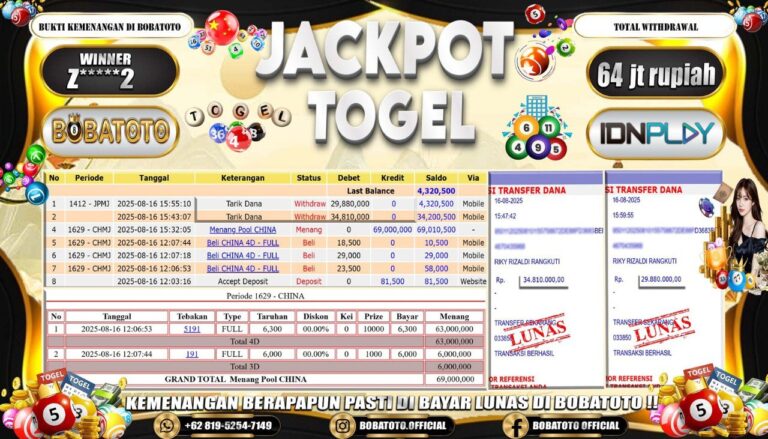 BOBATOTO – Selamat kepada User id : R*****K Telah berhasil mendapatkan kemenangan besar pada permainan TOGEL OREGON 9 Dengan kemenangan Sebesar Rp.60,000,000,-. Setelah mengisi formulir withdraw dengan kurung waktu hanya 5 – 10 menit pihak bobatoto sudah melakukan transfer kepada pemilik Userid dan dana sudah dapat di cairkan oleh pemenang. Bukti pembayaran yang kami berikan merupakan bukti pembayaran yang SAH / VALID yang…