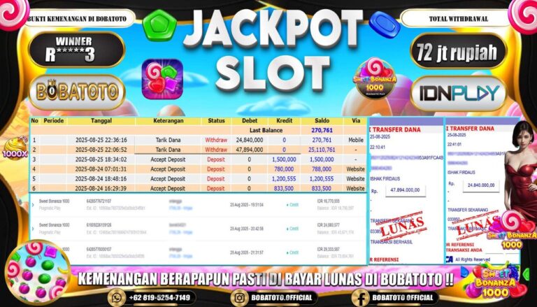 BOBATOTO – Selamat kepada User id : K******5 Telah berhasil mendapatkan kemenangan besar pada permainan SLOT SWEET BONANZA 1000 Dengan kemenangan Sebesar Rp.73,000,000,-. Setelah mengisi formulir withdraw dengan kurung waktu hanya 5 – 10 menit pihak bobatoto sudah melakukan transfer kepada pemilik Userid dan dana sudah dapat di cairkan oleh pemenang. Bukti pembayaran yang kami berikan merupakan bukti pembayaran yang SAH /…