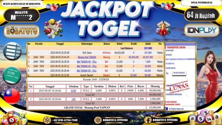 BOBATOTO – Selamat kepada User id : M******2 Telah berhasil mendapatkan kemenangan besar pada permainan TOGEL TAIWAN Dengan kemenangan Sebesar Rp.64,000,000,-. Setelah mengisi formulir withdraw dengan kurung waktu hanya 5 – 10 menit pihak bobatoto sudah melakukan transfer kepada pemilik Userid dan dana sudah dapat di cairkan oleh pemenang. Bukti pembayaran yang kami berikan merupakan bukti pembayaran yang SAH / VALID yang langung…