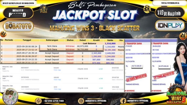 BOBATOTO – Selamat kepada User id :Q*****T Telah berhasil mendapatkan kemenangan besar pada permainan SLOT MAHJONG WINS-3 BLACK SCATTER Dengan kemenangan Sebesar Rp.74,000,000-. Setelah mengisi formulir withdraw dengan kurung waktu hanya 5 – 10 menit pihak bobatoto sudah melakukan transfer kepada pemilik Userid dan dana sudah dapat di cairkan oleh pemenang. Bukti pembayaran yang kami berikan merupakan bukti pembayaran yang SAH /…