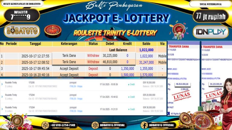 BOBATOTO – Selamat kepada User id : 7*****9 Telah berhasil mendapatkan kemenangan besar pada permainan JACKPOT E- LOTTERY ROULETTE TRINITY E-LOTTERY Dengan kemenangan Sebesar Rp.77,000,000,-. Setelah mengisi formulir withdraw dengan kurung waktu hanya 5 – 10 menit pihak bobatoto sudah melakukan transfer kepada pemilik Userid dan dana sudah dapat di cairkan oleh pemenang. Bukti pembayaran yang kami berikan merupakan bukti pembayaran…