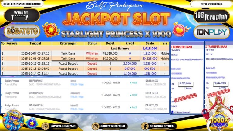 BOBATOTO – Selamat kepada User id : N*****2 Telah berhasil mendapatkan kemenangan besar pada permainan SLOT PRAGMATIC STARLIGHT PRINCESS Dengan kemenangan Sebesar Rp.78,000,000,-. Setelah mengisi formulir withdraw dengan kurung waktu hanya 5 – 10 menit pihak bobatoto sudah melakukan transfer kepada pemilik Userid dan dana sudah dapat di cairkan oleh pemenang. Bukti pembayaran yang kami berikan merupakan bukti pembayaran yang SAH /…