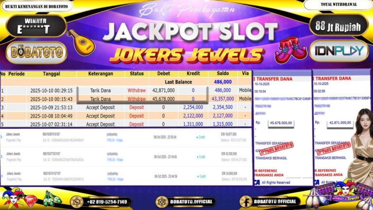 BOBATOTO – Selamat kepada User id : E******T Telah berhasil mendapatkan kemenangan besar pada permainan SLOT JOKERS JEWELS Dengan kemenangan Sebesar Rp.88,000,000,-. Setelah mengisi formulir withdraw dengan kurung waktu hanya 5 – 10 menit pihak bobatoto sudah melakukan transfer kepada pemilik Userid dan dana sudah dapat di cairkan oleh pemenang. Bukti pembayaran yang kami berikan merupakan bukti pembayaran yang SAH / VALID yang…