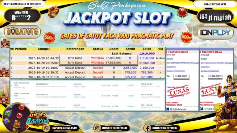 BOBATOTO – Selamat kepada User id : R******2 Telah berhasil mendapatkan kemenangan besar pada permainan SLOT PRAGMATIC GATES OF GATOT KACA 1000 Dengan kemenangan Sebesar Rp.104,000,000,-. Setelah mengisi formulir withdraw dengan kurung waktu hanya 5 – 10 menit pihak bobatoto sudah melakukan transfer kepada pemilik Userid dan dana sudah dapat di cairkan oleh pemenang. Bukti pembayaran yang kami berikan merupakan bukti…