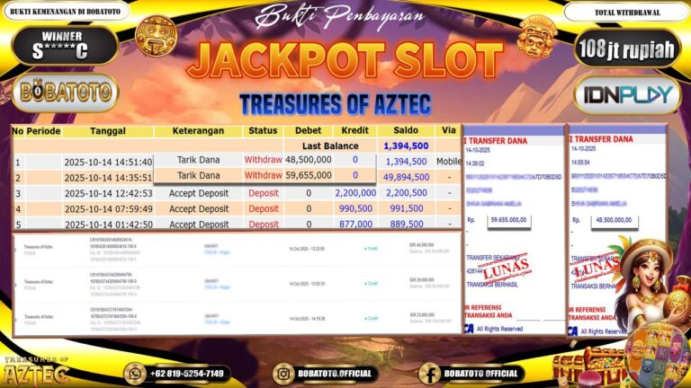 BOBATOTO – Selamat kepada User id : S*****C Telah berhasil mendapatkan kemenangan besar pada permainan SLOT TREASURES OF AZTEC Dengan kemenangan Sebesar Rp.108,000,000,-. Setelah mengisi formulir withdraw dengan kurung waktu hanya 5 – 10 menit pihak bobatoto sudah melakukan transfer kepada pemilik Userid dan dana sudah dapat di cairkan oleh pemenang. Bukti pembayaran yang kami berikan merupakan bukti pembayaran yang SAH…