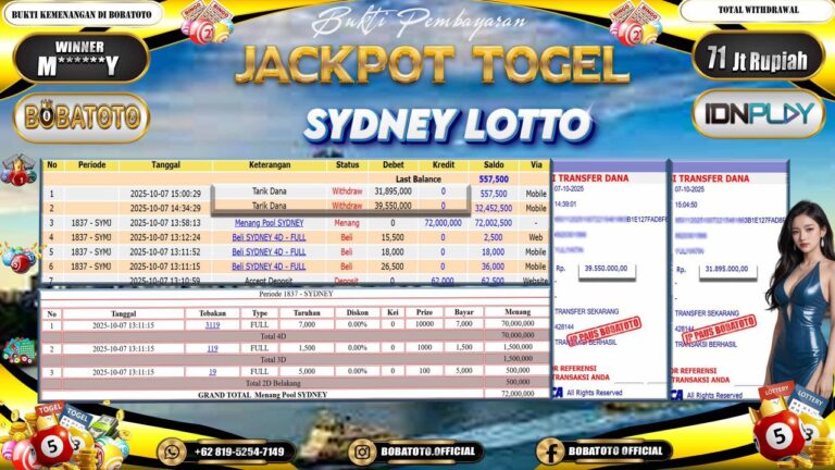 BOBATOTO – Selamat kepada User id : N*****S Telah berhasil mendapatkan kemenangan besar pada permainan TOGEL SYDNEY LOTTO Dengan kemenangan Sebesar Rp.71,000,000,-. Setelah mengisi formulir withdraw dengan kurung waktu hanya 5 – 10 menit pihak bobatoto sudah melakukan transfer kepada pemilik Userid dan dana sudah dapat di cairkan oleh pemenang. Bukti pembayaran yang kami berikan merupakan bukti pembayaran yang SAH / VALID yang…