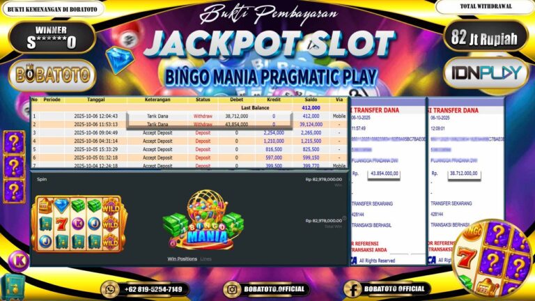 BOBATOTO – Selamat kepada User id : S******0 Telah berhasil mendapatkan kemenangan besar pada permainan BINGO MANIA PRAGMATIC PLAY Dengan kemenangan Sebesar Rp.82,000,000,-. Setelah mengisi formulir withdraw dengan kurung waktu hanya 5 – 10 menit pihak bobatoto sudah melakukan transfer kepada pemilik Userid dan dana sudah dapat di cairkan oleh pemenang. Bukti pembayaran yang kami berikan merupakan bukti pembayaran yang SAH…