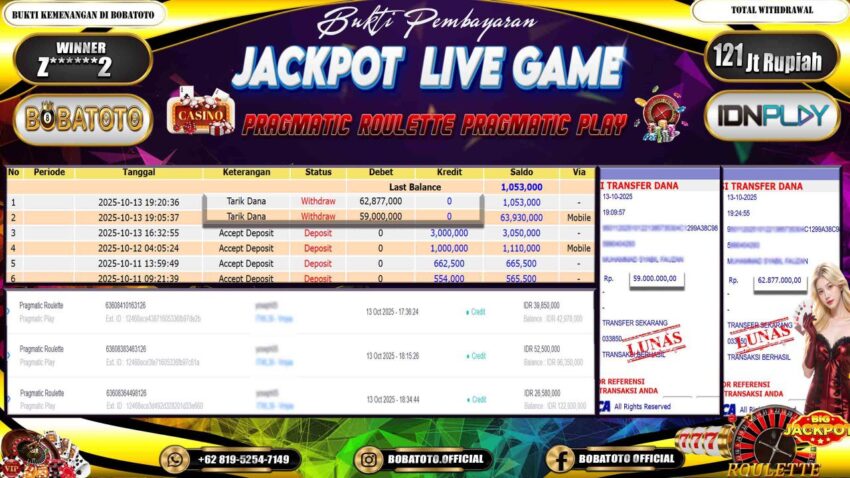 BOBATOTO – Selamat kepada User id : Z*****2 Telah berhasil mendapatkan kemenangan besar pada permainan  LIVE CASINO ROULETTE  Dengan kemenangan Sebesar Rp.121,000,000,-. Setelah mengisi formulir withdraw dengan kurung waktu hanya 5 – 10 menit pihak bobatoto sudah melakukan transfer kepada pemilik Userid dan dana sudah dapat di cairkan oleh pemenang. Bukti pembayaran yang kami berikan merupakan bukti pembayaran yang SAH / VALID yang langung di dapatkan melaui tanda transfer transaksi dari Bank yang di tuju.