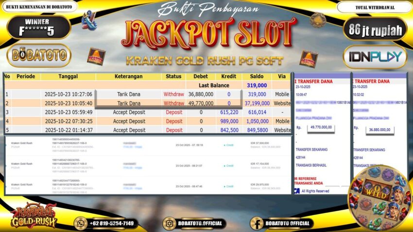 BOBATOTO – Selamat kepada User id :F******5 Telah berhasil mendapatkan kemenangan besar pada permainan  SLOT KRAKEN GOLD RUSH 2  Dengan kemenangan Sebesar Rp.86,000,000-. Setelah mengisi formulir withdraw dengan kurung waktu hanya 5 – 10 menit pihak bobatoto sudah melakukan transfer kepada pemilik Userid dan dana sudah dapat di cairkan oleh pemenang. Bukti pembayaran yang kami berikan merupakan bukti pembayaran yang SAH / VALID yang langung di dapatkan melaui tanda transfer transaksi dari Bank yang di tuju.