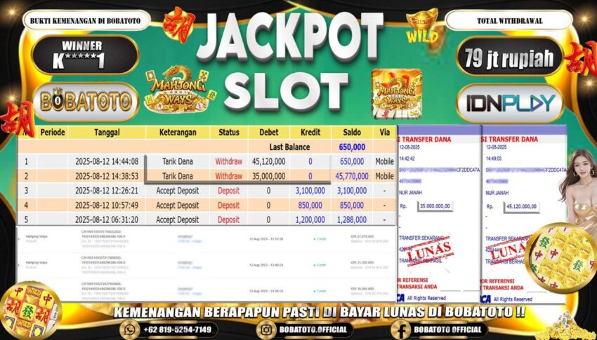 BOBATOTO – Selamat kepada User id :K*****1 Telah berhasil mendapatkan kemenangan besar pada permainan  SLOT MAHJONG WAYS  Dengan kemenangan Sebesar Rp.79,000,000-. Setelah mengisi formulir withdraw dengan kurung waktu hanya 5 – 10 menit pihak bobatoto sudah melakukan transfer kepada pemilik Userid dan dana sudah dapat di cairkan oleh pemenang. Bukti pembayaran yang kami berikan merupakan bukti pembayaran yang SAH / VALID yang langung di dapatkan melaui tanda transfer transaksi dari Bank yang di tuju.