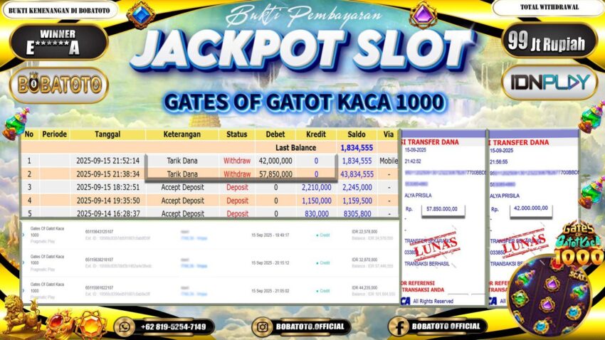 BOBATOTO – Selamat kepada User id : E******A Telah berhasil mendapatkan kemenangan besar pada permainan SLOT PRAGMATIC GATES OF GATOT KACA 1000 Dengan kemenangan Sebesar Rp.99,000,000,-. Setelah mengisi formulir withdraw dengan kurung waktu hanya 5 – 10 menit pihak bobatoto sudah melakukan transfer kepada pemilik Userid dan dana sudah dapat di cairkan oleh pemenang. Bukti pembayaran yang kami berikan merupakan bukti pembayaran yang SAH / VALID yang langung di dapatkan melaui tanda transfer transaksi dari Bank yang di tuju.