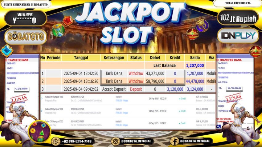BOBATOTO – Selamat kepada User id : Y******0 Telah berhasil mendapatkan kemenangan besar pada permainan SLOT PRAGMATIC GATES OF OLYMPUS 1000 Dengan kemenangan Sebesar Rp.102,000,000,-. Setelah mengisi formulir withdraw dengan kurung waktu hanya 5 – 10 menit pihak bobatoto sudah melakukan transfer kepada pemilik Userid dan dana sudah dapat di cairkan oleh pemenang. Bukti pembayaran yang kami berikan merupakan bukti pembayaran yang SAH / VALID yang langung di dapatkan melaui tanda transfer transaksi dari Bank yang di tuju.