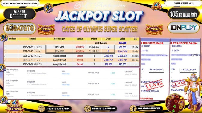 BOBATOTO – Selamat kepada User id : E******T Telah berhasil mendapatkan kemenangan besar pada permainan SLOT PRAGMATIC GATES OF OLYMPUS SUPER SCATTER Dengan kemenangan Sebesar Rp.105,000,000,-. Setelah mengisi formulir withdraw dengan kurung waktu hanya 5 – 10 menit pihak bobatoto sudah melakukan transfer kepada pemilik Userid dan dana sudah dapat di cairkan oleh pemenang. Bukti pembayaran yang kami berikan merupakan bukti pembayaran yang SAH / VALID yang langung di dapatkan melaui tanda transfer transaksi dari Bank yang di tuju.
