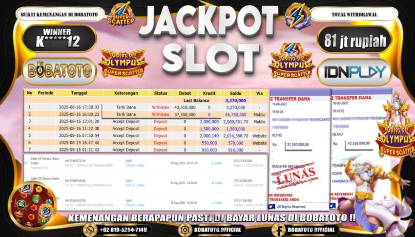 BOBATOTO – Selamat kepada User id : K*****12 Telah berhasil mendapatkan kemenangan besar pada permainan  SLOT PRAGMATIC GATES OF OLYMPUS SUPER SCATTER  Dengan kemenangan Sebesar Rp.81,000,000,-. Setelah mengisi formulir withdraw dengan kurung waktu hanya 5 – 10 menit pihak bobatoto sudah melakukan transfer kepada pemilik Userid dan dana sudah dapat di cairkan oleh pemenang. Bukti pembayaran yang kami berikan merupakan bukti pembayaran yang SAH / VALID yang langung di dapatkan melaui tanda transfer transaksi dari Bank yang di tuju.