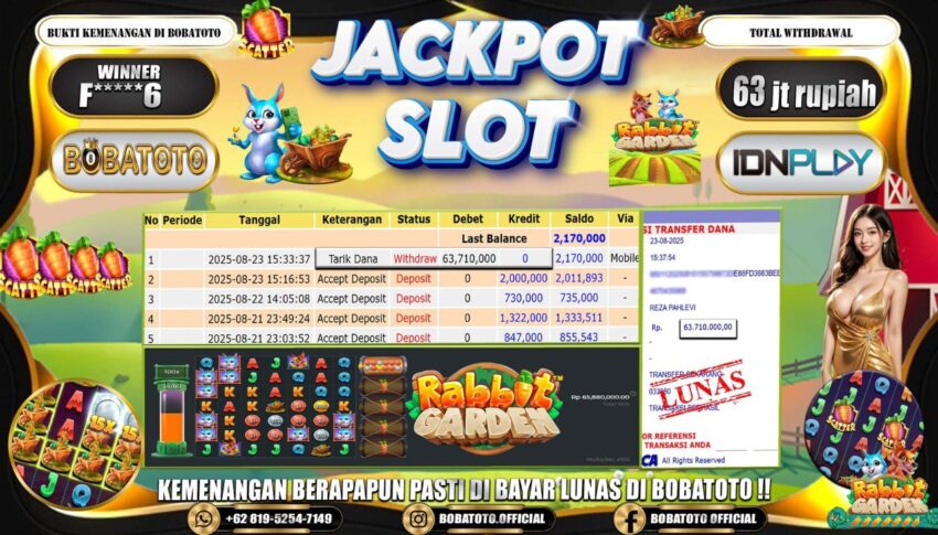 BOBATOTO – Selamat kepada User id : F*****6 Telah berhasil mendapatkan kemenangan besar pada permainan  SLOT PRAGMATIC RABBIT GARDEN  Dengan kemenangan Sebesar Rp.63,000,000,-. Setelah mengisi formulir withdraw dengan kurung waktu hanya 5 – 10 menit pihak bobatoto sudah melakukan transfer kepada pemilik Userid dan dana sudah dapat di cairkan oleh pemenang. Bukti pembayaran yang kami berikan merupakan bukti pembayaran yang SAH / VALID yang langung di dapatkan melaui tanda transfer transaksi dari Bank yang di tuju.