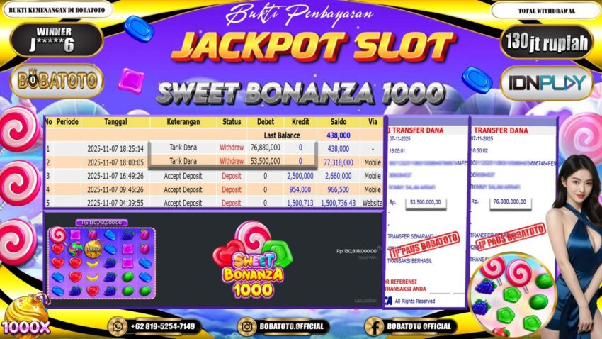 BOBATOTO – Selamat kepada User id : J*****6 Telah berhasil mendapatkan kemenangan besar pada permainan  SLOT SWEET BONANZA 1000  Dengan kemenangan Sebesar Rp.130,000,000,-. Setelah mengisi formulir withdraw dengan kurung waktu hanya 5 – 10 menit pihak bobatoto sudah melakukan transfer kepada pemilik Userid dan dana sudah dapat di cairkan oleh pemenang. Bukti pembayaran yang kami berikan merupakan bukti pembayaran yang SAH / VALID yang langung di dapatkan melaui tanda transfer transaksi dari Bank yang di tuju.