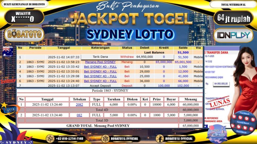 BOBATOTO – Selamat kepada User id : X******0 Telah berhasil mendapatkan kemenangan besar pada permainan TOGEL SYDNEY LOTTO Dengan kemenangan Sebesar Rp.64,000,000,-. Setelah mengisi formulir withdraw dengan kurung waktu hanya 5 – 10 menit pihak bobatoto sudah melakukan transfer kepada pemilik Userid dan dana sudah dapat di cairkan oleh pemenang. Bukti pembayaran yang kami berikan merupakan bukti pembayaran yang SAH / VALID yang langung di dapatkan melaui tanda transfer transaksi dari Bank yang di tuju.