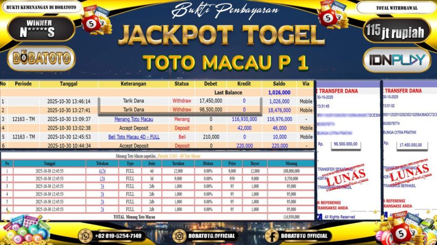 BOBATOTO – Selamat kepada User id : N*****S Telah berhasil mendapatkan kemenangan besar pada permainan TOGEL TOTO MACAU P1 Dengan kemenangan Sebesar Rp.115,000,000,-. Setelah mengisi formulir withdraw dengan kurung waktu hanya 5 – 10 menit pihak bobatoto sudah melakukan transfer kepada pemilik Userid dan dana sudah dapat di cairkan oleh pemenang. Bukti pembayaran yang kami berikan merupakan bukti pembayaran yang SAH / VALID yang langung di dapatkan melaui tanda transfer transaksi dari Bank yang di tuju.